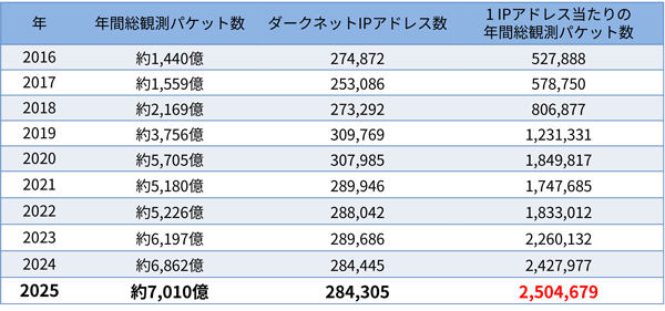 今回公開したレポートによると、NICTERのダークネット観測網(約28万IPアドレス)で2025年に観測されたサイバー攻撃関連通信は、合計7010億パケットに上り、1IPアドレス当たり約250万パケットが1年間に届いた計算となる。