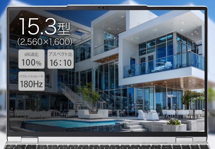 ディスプレイは15.3型WQXGA液晶(解像度2,560×1,600)を採用しており、アスペクト比16:10により縦方向の作業領域を拡大しています。sRGBカラーキャリブレーションで正確な色再現に加え、180Hzの高リフレッシュレートにより、動画編集や3Dモデリングなどの作業を快適に行えます。映像出力端子はHDMI×2、mini DisplayPort、USB Type-C×2を備え、液晶タブレットなど外部機器との接続性を高めています。また、Wi-Fi 7対応や最大99Whの大容量バッテリーを搭載し、持ち運びながらでも安心してクリエイティブワークを継続できます。「DAIV S5」は、持ち運びやすいサイズ感と、最新GPUによる優れた処理能力を兼ね備えており、建築・設計エンジニア、住宅デザイナー、映像・写真・イラスト制作など幅広いクリエイターに最適な製品となります。