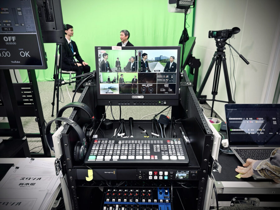 スタジオにはATEM Mini Extreme ISOスイッチャーとHyperDeck Studio HD Plusが導入されており、2台のHDMIカメラ、音声ミキサー、MacBook Proの出力がATEMスイッチャーに接続されている。グリーンバック撮影をしながら任意の背景を合成し、カメラ映像やスライド資料のスイッチングを行うことができる。それらのスイッチング映像はHyperDeck Studio HD Plusで収録される。さらにATEMスイッチャーでISO収録をすることにより、収録後にスイッチングミスの修正が必要な場合や、さらに細かな効果や編集を加えたい場合にもDaVinci Resolveで簡単に編集ができるようになっている。