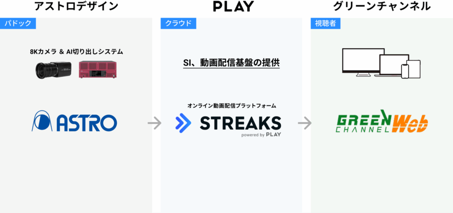2012年、競馬場に行かなくても投票できるインターネット投票システムが導入されて以降、インターネットを通じ競馬を楽しむユーザーは年々増加傾向にある。そこで、レースの映像視聴だけでなく、レース前のパドックを競馬場さながらの臨場感で見ることができるよう、今回の「パドック映像マルチ配信システム」が開発された。PLAYは開発にあたり、OTT 配信に必要なトータルワークフローを提供するオンライン動画配信プラットフォーム「STREAKS」の提供、および複数の8KカメラのAI切り出し映像を配信するためのシステムインテグレーションを担当した。