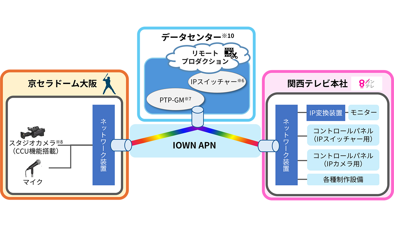 NTT西日本グループは、関西テレビと共同で、2025年9月6日に京セラドーム大阪で開催されたプロ野球公式戦「オリックス・バファローズ 対 北海道日本ハムファイターズ」の地上波放送向け中継において、IOWNオールフォトニクス・ネットワーク(IOWN APN)を活用し、データセンター集約型の制作設備を遠隔操作するリモートプロダクション環境を構築・運用したと発表した。