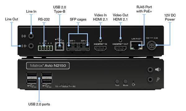 用途に応じて送信機/受信機のいずれにも設定でき、システム構成に応じた柔軟な導入が可能。最大4K解像度映像を、デュアル10GbE構成では非圧縮伝送で、1GbEネットワークでは圧縮により長距離伝送を実現する。伝送用SFPポートを2基搭載し、冗長構成に対応。さらにPoE+(IEEE 802.3at)に対応し、配線管理も最適化できる。