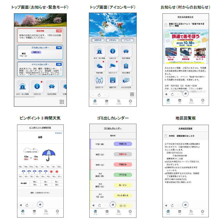 ▽「Lアラート」や気象・防災情報と連携した安全・安心情報▽役場や村内の機関・団体(社会福祉協議会、観光協会等)、UCVからのお知らせ▽村内12地点のピンポイント天気(3時間/週間)、道路・河川の定点カメラ画像▽告別式情報、ゴミ出しカレンダー、地域イベント情報、地区回覧板▽バス時刻表、飲食店・観光施設の案内、図書館の貸し出し本の検索・予約▽災害時の避難所検索(『全国避難所ガイド』(ファーストメディア提供)連携/全国17万カ所に対応)。