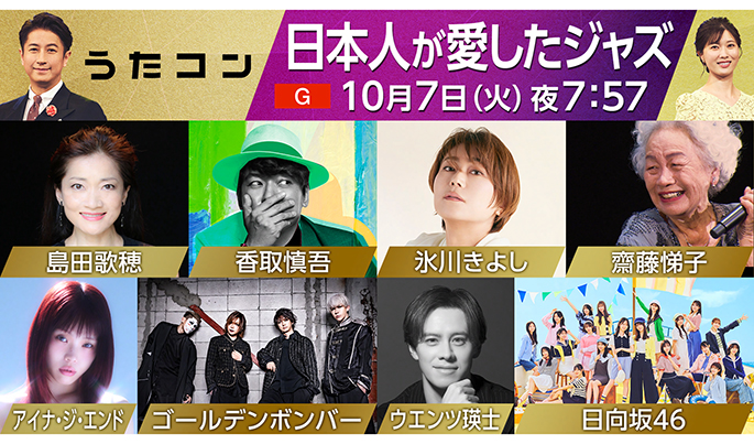 10月7日は、日本人が愛したジャズを特集。幕開きは香取慎吾をはじめ、出演歌手がスウィング・ジャズの代表曲の一つ「SING, SING, SING」を届ける。続いて氷川きよしはジャズを愛した美空ひばりも歌った「虹の彼方」を歌唱、番組初登場のウエンツ瑛士はフランク・シナトラが歌った名曲「New York, New York」をカバーする。そして、今ブレイク中のアイナ・ジ・エンドは映画「サウンド・オブ・ミュージック」やジョン・コルトレーンの名演でも知られる「私のお気に入り~My Favorite Things」を披露する。さらに去年デビュー50周年を迎えた島田歌穂は、名曲「チュニジアの夜」を歌う。