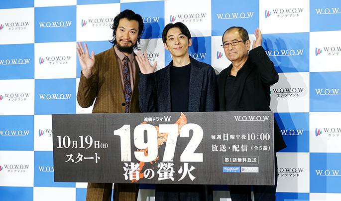 WOWOWはこのほど、10月19日から放送する「連続ドラマW 1972 渚の蛍火」の完成報告会をWOWOW放送センター(東京都江東区)で開催した。報告会には、出演者の高橋一生、青木崇高と平山秀幸監督が登壇した。
