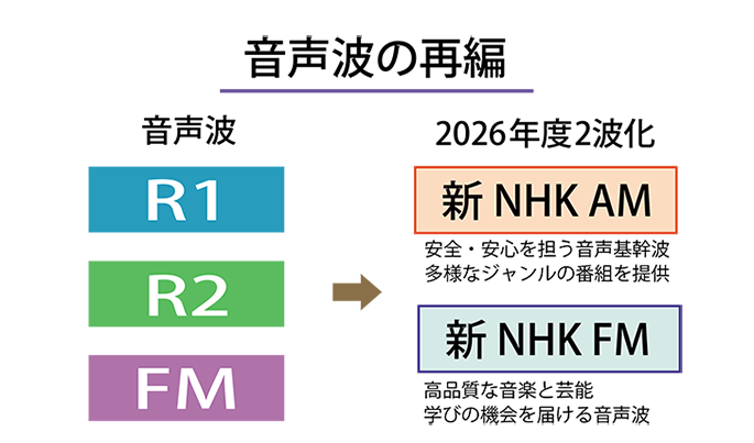 NHKは現在発表している「経営計画2024―2026年度」の中で「事業支出改革」の一環として、「コンテンツの総量削減、設備投資の大幅削減等による収支改善(事業支出削減の実現)」「コンテンツDXの推進、クラウド時代のワークフロー見直し等での実現」とともに、「メディアの整理・削減」の取り組みとして2026年3月末に音声波の再編を行うことを掲げており、現行のラジオ第1、ラジオ第2、NHK―FMの3波体制を、2026年度からAMの一波とFM波一波の2波にする方針を明記している。