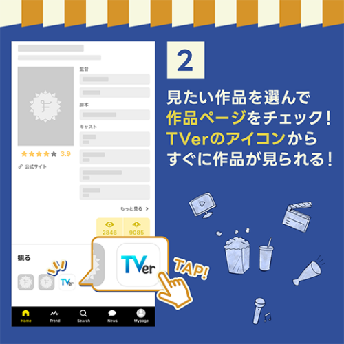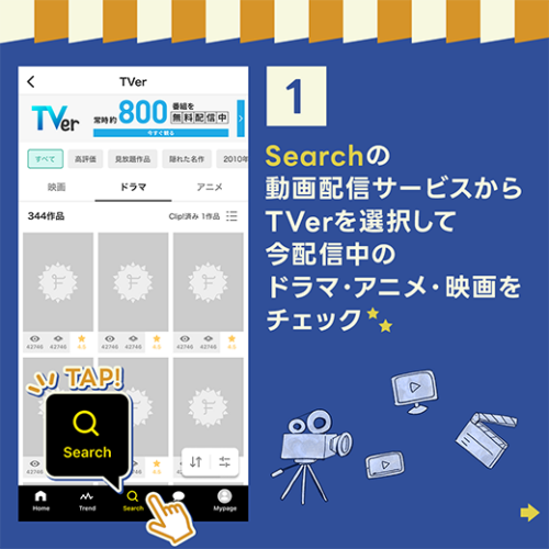 TVerで配信中の作品一覧を見るには、Filmarksウェブサイトにある「ドラマ」「アニメ」それぞれのタブ、もしくはFilmarksアプリの「Search」タブから、「TVer」を選択する。