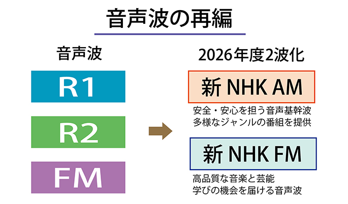 現在のラジオ第1放送、ラジオ第2放送、FM放送の3波は、番組改定にあわせ3月30日に「NHK AM」と「NHK FM」の2波に再編される。各波には、どこでも聴くことができる“暮らしの命綱(ライフライン)”として、正確で迅速なニュースや生活情報、日々の暮らしに潤いをもたらす音楽番組や学びに役立つ教育番組を届ける、という役割が与えられる。