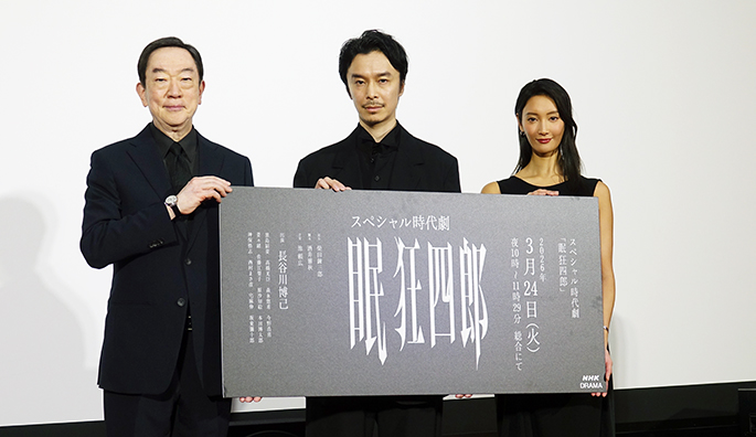 NHKはこのほど、3月24日に総合で放送するスペシャル時代劇「眠狂四郎」の完成披露試写会見を、東京・渋谷の放送センターで開いた。会見には、主演の長谷川博己をはじめ、菜々緒、坂東彌十郎が登壇した。