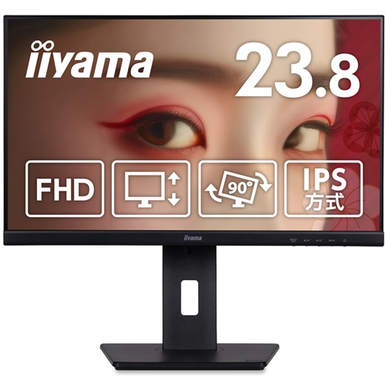 ●23.8型iiyama 液晶ディスプレイ。フルHD解像度でIPS方式。スタンドは高さ、角度の調整が可能で、縦回転にも対応します。