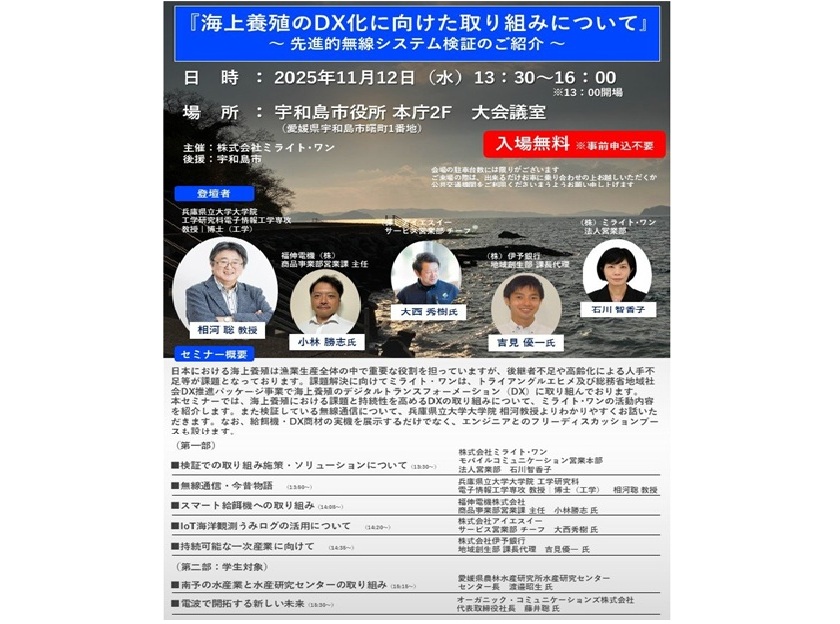 また、本セミナーは、兵庫県立大学大学院をはじめとし、全7社・団体にて開催され、海上養殖事業者および愛媛県内の学生(大学生及び高校生)を対象としています。ミライト・ワンは「検証での取り組み施策・ソリューション」についてを講演予定です。
