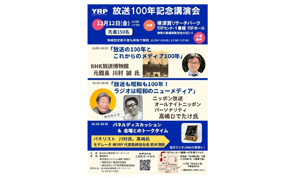2025年は日本国内での放送の開始から100周年となります。放送技術の礎たる電波・無線技術に特化した研究開発拠点としてスタートした横須賀リサーチパーク(YRP)では、これを記念し、2025年12月12日(金)に、YRPにおいて「放送100年記念講演会」を開催します。