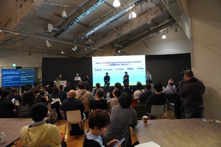 初日の2日には、セッション1「AIは映像制作をどう変えるか?」が行われた。モデレーターは会田正裕氏、ゲストはYves Dalbiez氏(映画監督)、ツジヤスヒロ氏(AIイノベーションディレクター・朝日広告社)、曽根隼人氏(映画監督)、大沢幸弘氏(高知工科大学客員教授/樹林AI㈱社外取締役)。