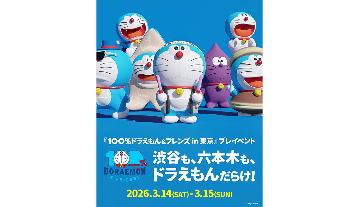 100%ドラえもん&フレンズ in 東京 製作委員会(テレビ朝日、藤子プロ、小学館、ADKエモーションズ、シンエイ動画、小学館集英社プロダクション)は、3月27日(金)より、世界中で愛される『ドラえもん』のまんが・アニメ・大長編の世界が一堂に会するドラえもん史上最大級のイベント、『100%ドラえもん&フレンズ in 東京』を東京ドリームパーク(東京都江東区)にて開催する。開幕に先駆け、プレイベントとして『渋谷も、六本木も、ドラえもんだらけ!』を、3月14日(土)・15日(日)の2日間、東京を象徴する2つの街、渋谷と六本木で開催し、多くのドラえもんが登場する、圧巻のエンタテインメントを届ける。