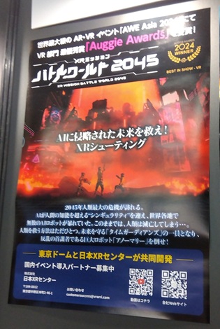 「バトルワールド2045」は、東京ドーム社と協働で開発したもの。世界最先端の技術でこれまでにない現実と仮想の境界を超える体験を実現した。世界発「Meta Quest3」を使ったマルチプレイヤー常設シューティングが特徴。世界最大のXRカンファレンス「AWE Asia 2024」に協働出展した実績をもつ。「AWE Asia 2024」内で、部門の最優秀賞も獲得している。
