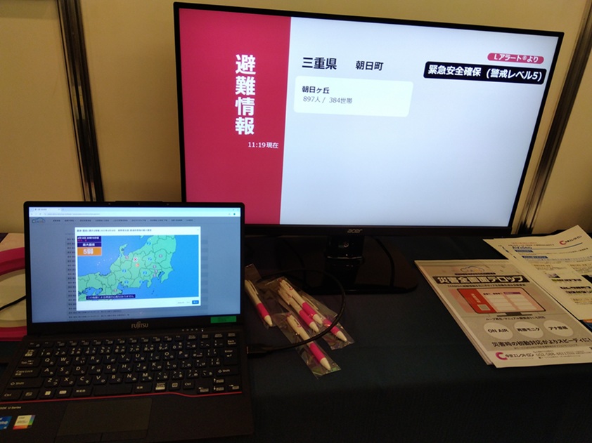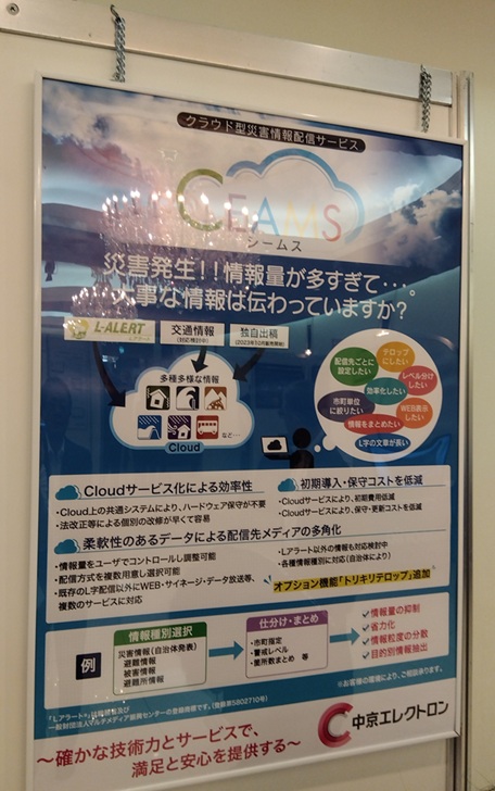 また「CEAMS」の避難情報を元にテロップを自動生成、自動更新する「災害全面テロップ」も展示。「災害全面テロップ」は画像とテロップのみであるが、同時に“音声”も伝えられるようサービスを検討していると、話した。