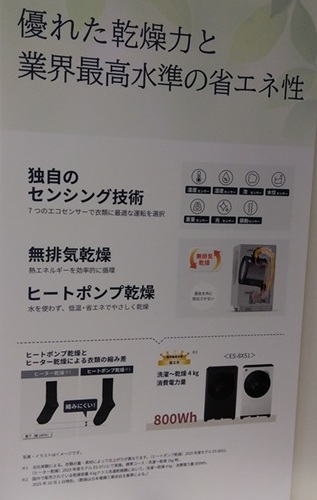 コンパクトタイプの洗濯乾燥機は、各社類似した競合品がある中、「ヒートポンプ乾燥方式」を採用し“省エネ”など機能面が充実していることで、価格で勝負するのではなく、プレミアム・コンパクト(付加価値)で提案していきたい、と話した。2025年10月10日より予約販売をスタートし、2025年11月27日発売を予定している。