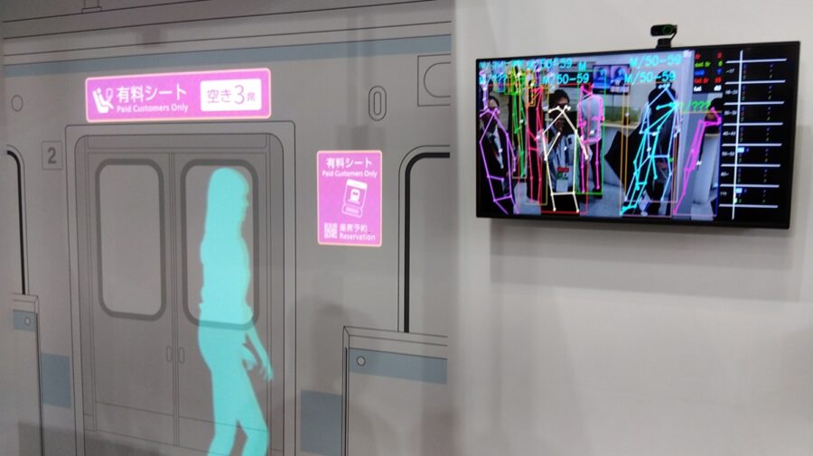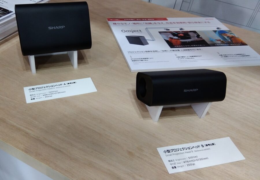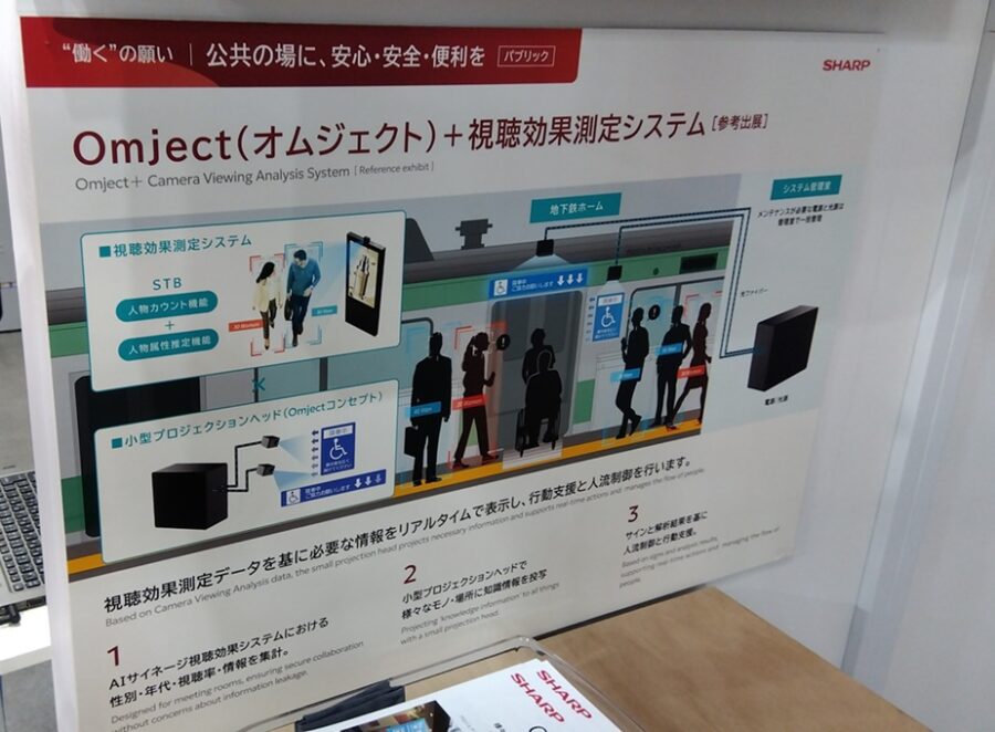 ・「Omject」はあらゆるモノ・場所に「知識情報」を投影し、自然に行動支援、人流制御を行うことができる小型プロジェクションヘッド。プロジェクション技術を活用し、”自然に”行動を支援、人流制御を行なう。特徴は、高輝度・高耐久・小型化であること。展示では地下鉄ホームを想定し、プロジェクションヘッドで電車本体に映し「人流制御」などを紹介した。