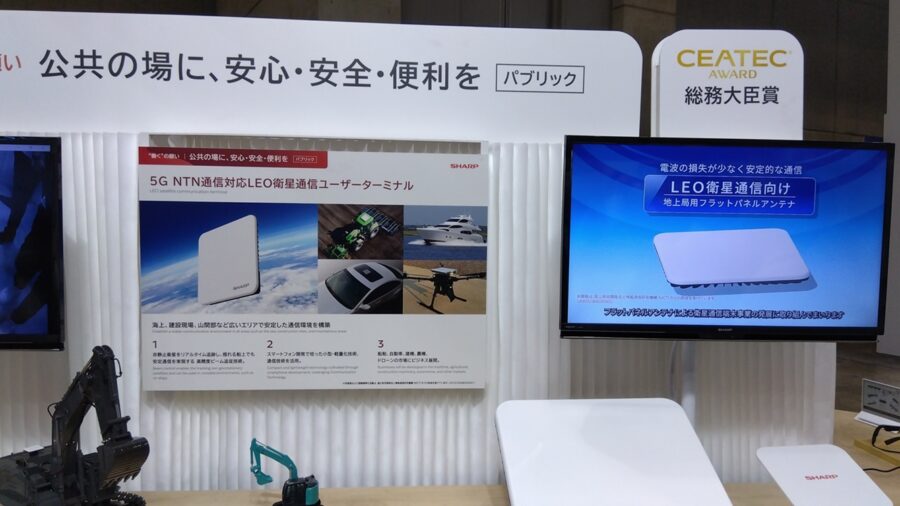 ・「5G NTN通信対応 LEO衛星通信ユーザーターミナル」(参考出展)は、スマートフォンの設計で培った小型軽量化の技術と通信技術を活用して開発中の衛星通信アンテナやモデムを統合した端末。本年2月には試作機を用いて、LEO衛星と5GNTN通信で接続する実証実験に世界で初めて成功した。7月開催「第2回 SPEXA -国際 宇宙ビジネス展-」に出展したが、数カ月後に今回「総務大臣賞」を受賞するなど、早期の実用化に向けて期待されている。