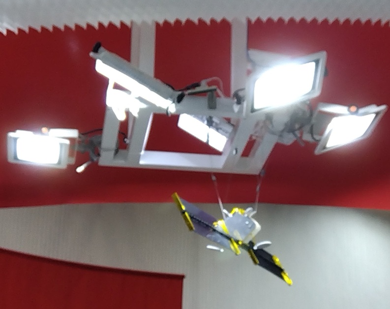 ブースでは、模擬衛星から11GHz帯の電波を使って地上側のターミナルへデータを送信するデモを実施した。リアルタイムの映像を送受信しており、建機の模型を遠隔で操縦する体験ができる。