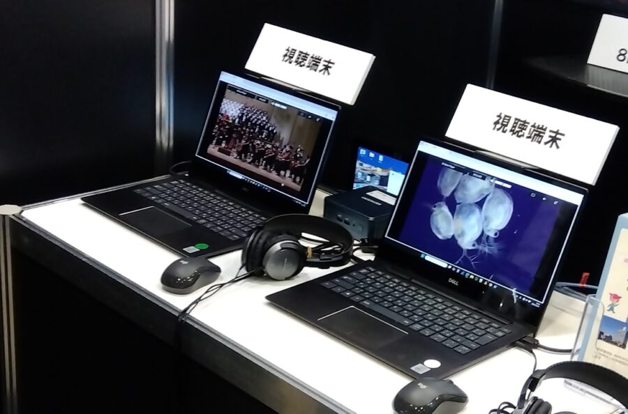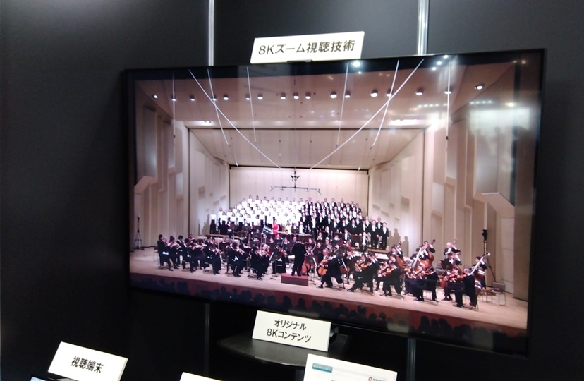 「8Kズーム視聴技術」は、タブレットなどの視聴端末で動画を視聴する際にタッチ操作で好きな領域を拡大しても解像度が低下しない動画視聴Webアプリケーション技術。8Kコンテンツの高精細な視聴体験を2Kディスプレーなどの視聴端末で提供可能だ。オーケストラの映像を実機ノートPC(端末、2Kディスプレー上で)を使用して体験することができた。