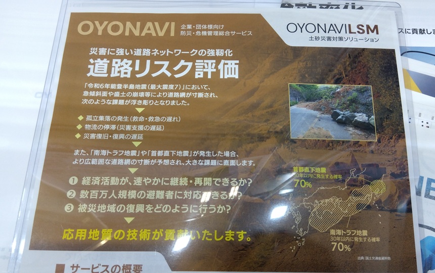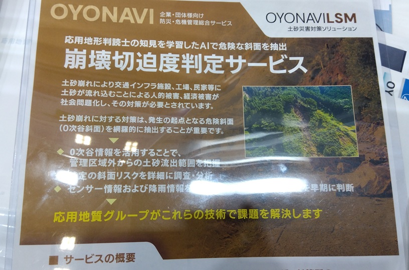 今回の展示では、「道路リスク評価」や「崩壊切迫度判定サービス」など、土砂災害対策ソリューションも紹介した。