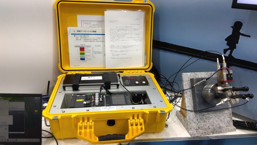 「VIBRES®」はアンカー頭部の引張り材余長部に設置した小型バイブレータの振動でアンカーの引張り材を共振させ、その固有振動周波数を読み取ることで緊張力を測定する技術。よって油圧ジャッキや仮設足場などの大掛かりな機材が不要であり、またアンカーの引張り材を載荷することなく測定できるため、効率的かつ安全・安価にグラウンドアンカーの健全度を点検することができる。