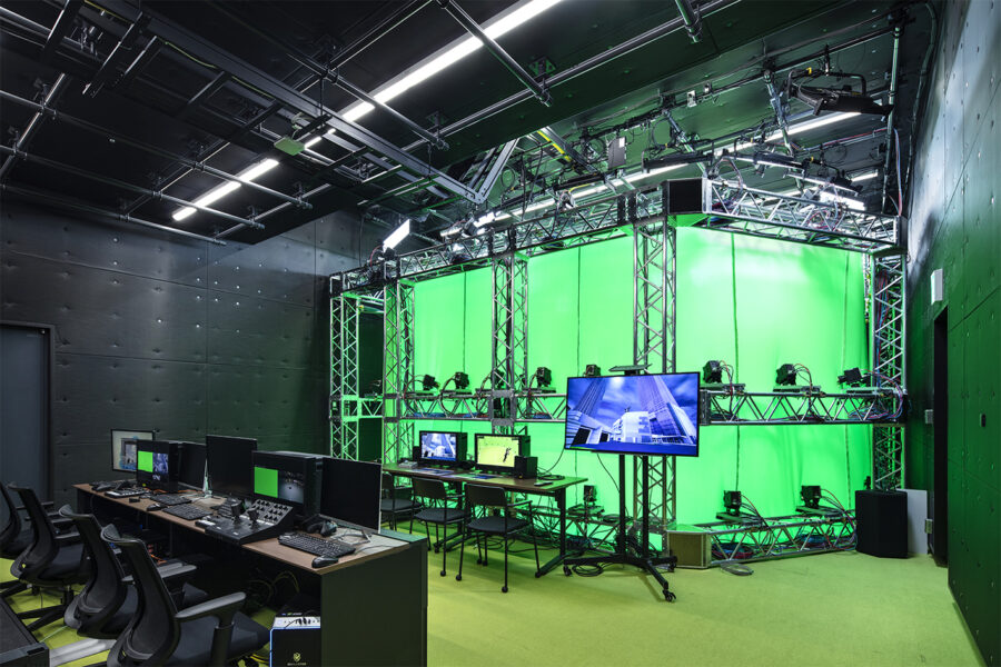 会場は面積:ステージ36㎡(撮影可能面積9㎡)で、天井高: ステージ3・8m(撮影可能高さ3m)。機材・備品は、音響(マイク/スピーカー)および映像がグリーンバックスクリーン(ステージ部分)。