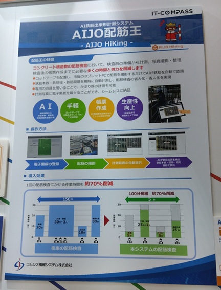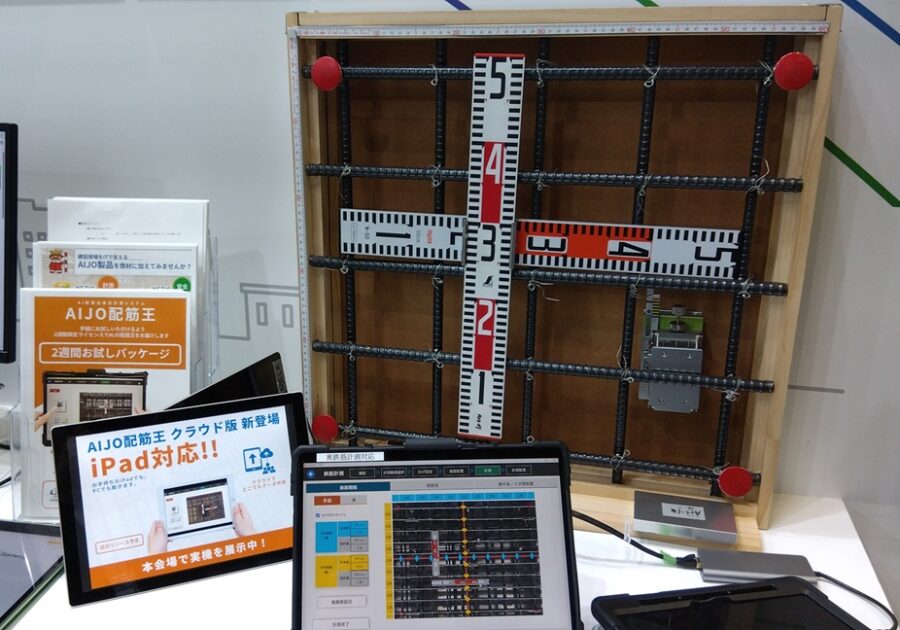 「AIJO配筋王」の特徴は、コンクリート構造物の配筋検査において、検査前の準備から計測、写真撮影・整理検査後の帳票作成までに必要な多くの時間と労力を削減する。市販のダブレットPCで配筋を撮影するだけでAIが鉄筋を自動で認識。鉄筋本数・鉄筋径・鉄筋間隔を瞬時に自動計測し、配筋検査の省力化、省人化を実現するという。