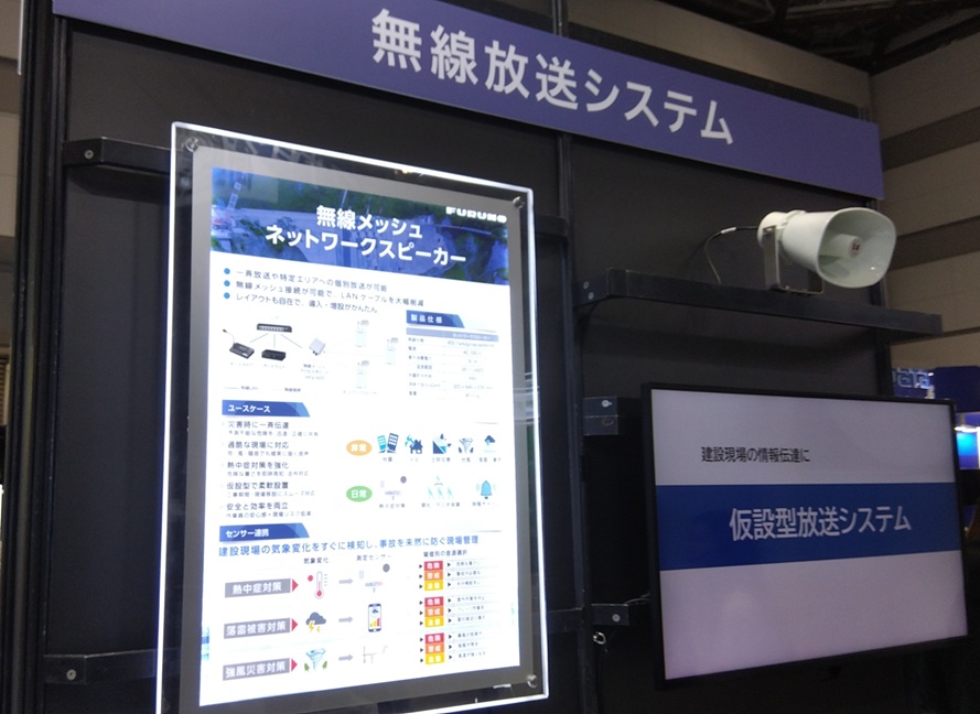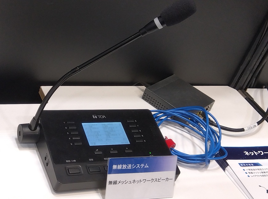 ・無線メッシュ ネットワークスピーカー実機を展示。製品特長は、一斉放送や特定エリアへの個別放送が可能。無線メッシュ接続が可能であり、LANケーブルを大幅に削減もできる。レイアウトも自在であり、導入・増設も簡単にできる。工場・倉庫など作業エリアごとに異なる作業指示や安全喚起(災害時の一斉伝達、熱中症対策など)を伝達できる。商業施設や交通機関などへの使用も期待が膨らむ。