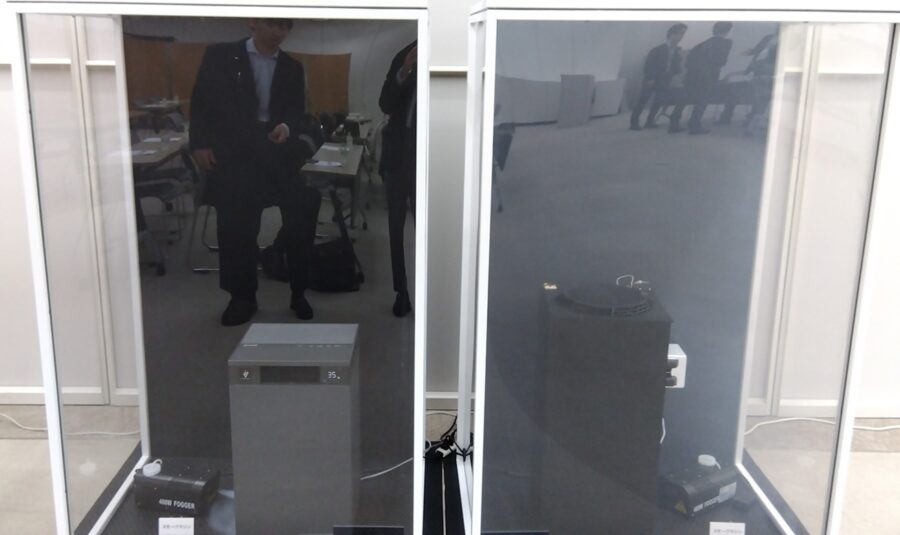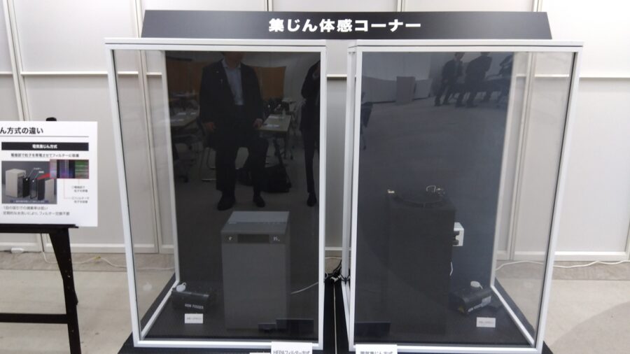 「集じん体感コーナー」 (左側:新製品HEPAフィルター) (右側:電気集じん方式の空気清浄機)