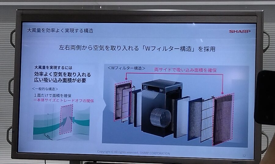 本体左右の側面に囚人(静電HEPA)・脱臭フィルターを設けた「Wフィルター構造」を採用した。これにより本体サイズを“コンパクト”に抑えながら、広いフィルター吸い込み面積を確保した。