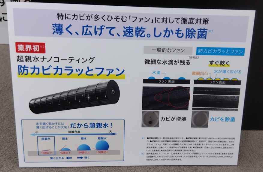 本シリーズの製品特長は、カビの増殖を抑制する「防カビカラッとファン」を新たに搭載したことだ。開発にあたり、真菌類研究の権威である県立広島大学の森永力名誉教授監修のもと、エアコン内部で特にカビが発生するのは「ファン」であることを解明した。