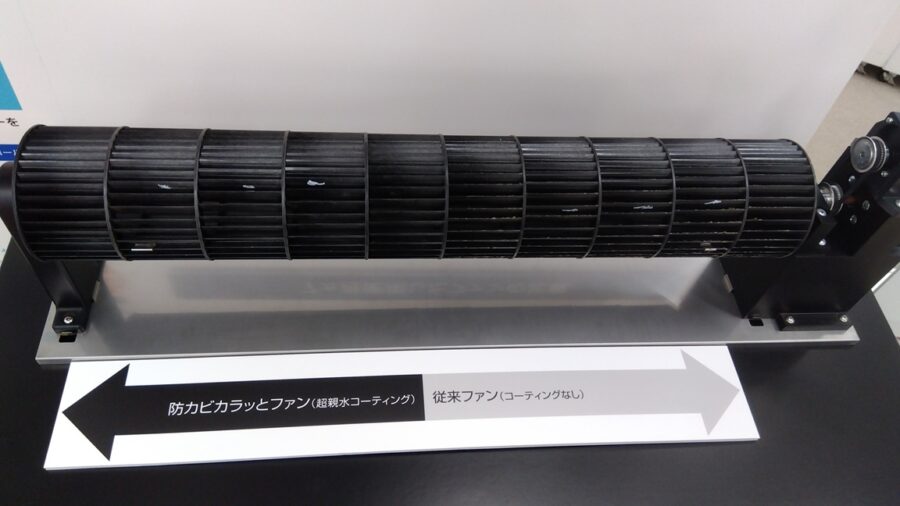 カビ対策として業界で初めてファンに「超親水ナノコーティング」を採用。カビの除菌性能を有することに加え、ファンの表面に残った水分を薄く広げることで速乾性を高め、カビ増殖の根本原因となる水分やホコリの付着を抑制することに成功した。