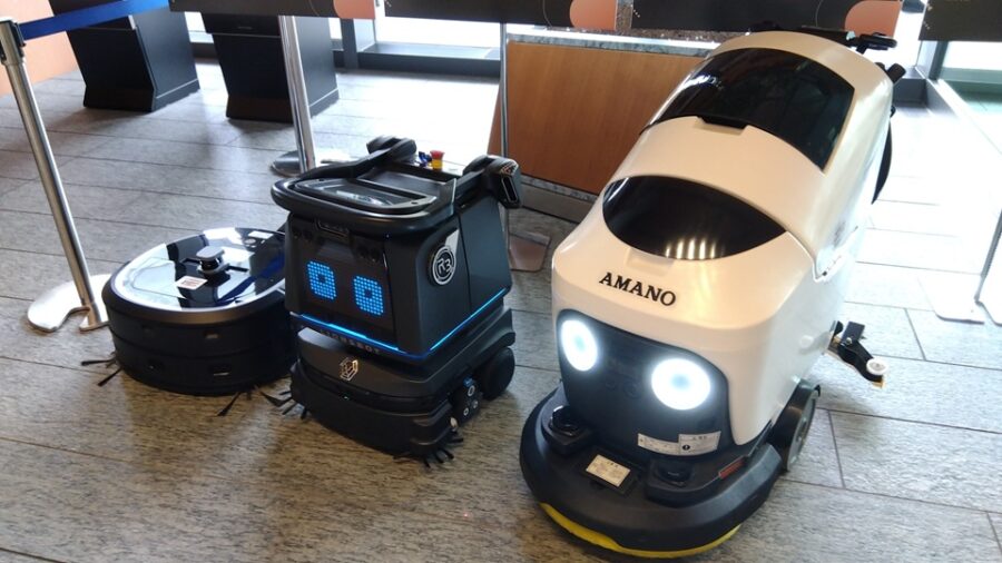 ハピボットは、広い石材などの床面を効率よく洗浄できる自動床清浄ロボット。広範囲の洗浄を得意としており、大規模施設などでは清掃スタッフの心強い味方になる。洗練されたデザイン性も魅力だ。