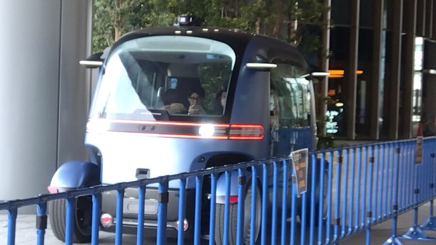 ロボバスは、ハンドルのない6人乗り自動運転バス。高性能センサーで安定走行し、手動切替も可能。