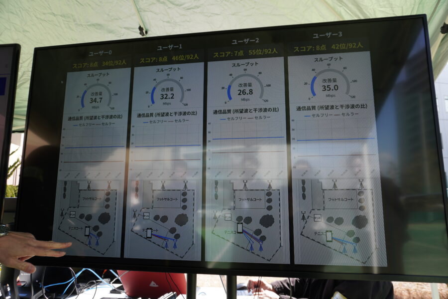 続いて「ユーザセントリックRANの実証試験」のブースでは、屋外に設置した6G通信技術の試作機によるデモンストレーションを解説。従来の通信方式では基地局の境界付近で接続が不安定になる課題があったが、新技術であるセルフリー構成では複数のアンテナを連携させることでこれを解決する。ユーザーの移動に合わせて最適なアンテナを自動で組み合わせるため、場所を問わず常に安定した高速通信が可能になるといい、展示ブースでは、参加者がスマートフォンを持ち歩き、従来方式と比較して通信品質が劇的に向上する様子をリアルタイムで体験することができた。この技術は、将来的にドローンやロボットが屋外で自在に活動するための重要なインフラとして期待されているという。