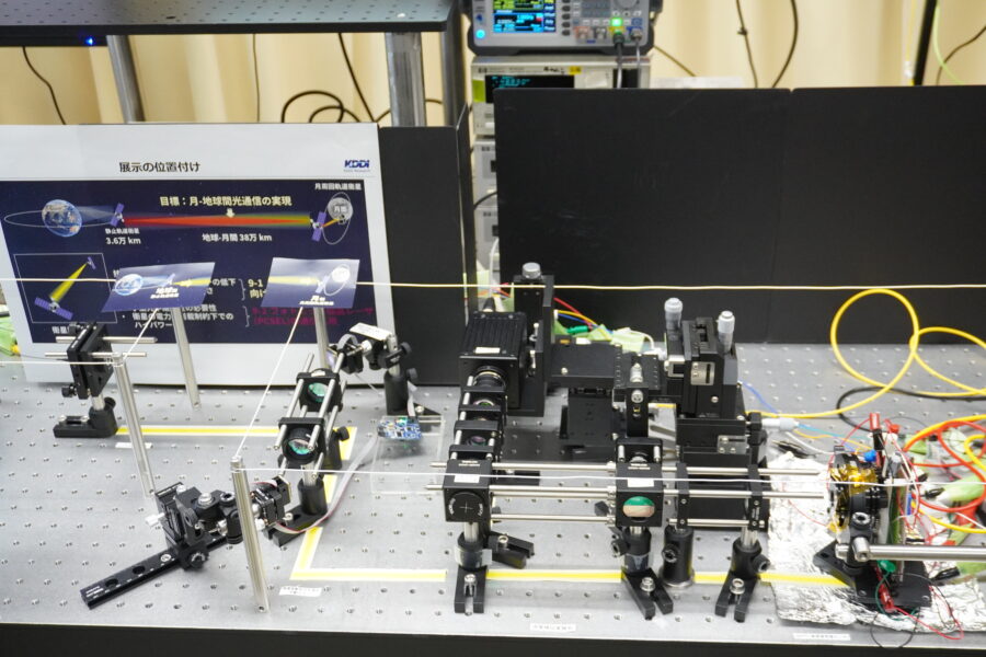 「月―地球間光通信の取り組み」と題したブースでは、同日発表した衛星間の追尾・捕捉・光行差補正技術と月面環境に耐えうる光アンテナ技術の検証について紹介。検証では、KDDI総研のほかに▽アークエッジ・スペース▽テックラボ▽トプコン▽三菱ケミカル―が参画し、月と地球間の光通信で必須となる「通信を確立し継続的に維持する追尾技術」「通信相手を捉える捕捉技術」「高速に動く衛星間の速度差による送受信光の角度ずれを補正する光行差補正技術」と、「月面の過酷な環境での通信に必要な広い温度範囲に対応する光アンテナの設計・製造技術」の確立を目指す。