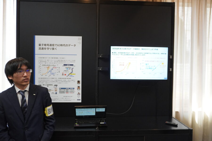 また「量子暗号通信でAI時代のデータ流通を守り抜く」と題したブースでは、AI社会の進展に伴う膨大なデータ通信を守るため、量子暗号通信の実証実験に成功したことを紹介。