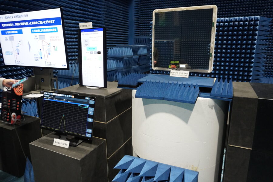 このうち、「高周波数帯の利用拡大 液晶メタサーフィス反射板」のブースでは、電波の拡散を防ぐ電波無響室を公開すると共に、電波の反射方向を制御する液晶メタサーフェス反射板について解説した。