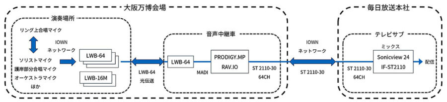 SMPTE ST 2110の運用における課題を解決するため、映像や音声の伝送、冗長化など、数々のテストを重ね、本番に臨んだ。万博会場のマイクなどの音声をOTARIのLIGHTWINDERシステム(LWB-64)に接続し、MADIにてDirectOut Technologies社PRODIGY.MPに入力しSMPTE ST 2110-30信号に変換され、IP伝送にて毎日放送本社まで送信した。「TASCAM Sonicview 24」は毎日放送本社テレビサブに設置され、SMPTE ST 2110-30信号を受信、配信用音声のミックスをそのまま「TASCAM Sonicview 24」で行った。