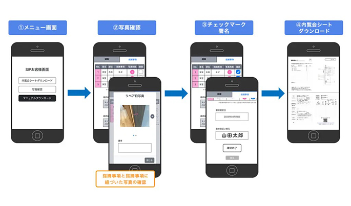 リペア前とリペア後の写真をスマートフォンから確認することが可能となるため、さまざまな事情で確認会への参加が難しい場合でも、購入者は遠隔から是正状況を自身で確認できる。これは、再来訪の負担軽減につながる。
