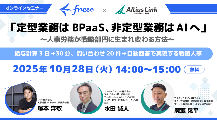 アルティウスリンク(所在地:東京都渋谷区、代表取締役社長:那谷 雅敏、以下 アルティウスリンク)は、フリー(本社:東京都品川区、CEO:佐々木 大輔、以下 freee)と、2025年10月28日(火)に共催オンラインセミナー「 『定型業務はBPaaS、非定型業務はAIへ』 〜人事労務が戦略部門に生まれ変わる方法〜」を開催します。
