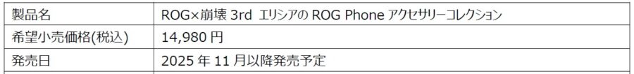 ASUS JAPAN株式会社は、HoYoverseが手掛ける人気ゲーム「HoYoverse」のキャラクター「エリシア」とコラボレーションした、「ROG×崩壊3rd エリシアのROG Phoneアクセサリーコレクション」を発表しました。本アクセサリーコレクションには、ROG Phoneケースをはじめ、エリシアのアクリルスタンドやカード、ステッカー、ケーブルプロテクター、SIMイジェクトピンなどの限定アクセサリーが含まれます。本コレクションは数量限定で、2025年11月以降、ASUS Store(https://www.asus.com/jp/store/)等のオンラインストアで発売予定です。