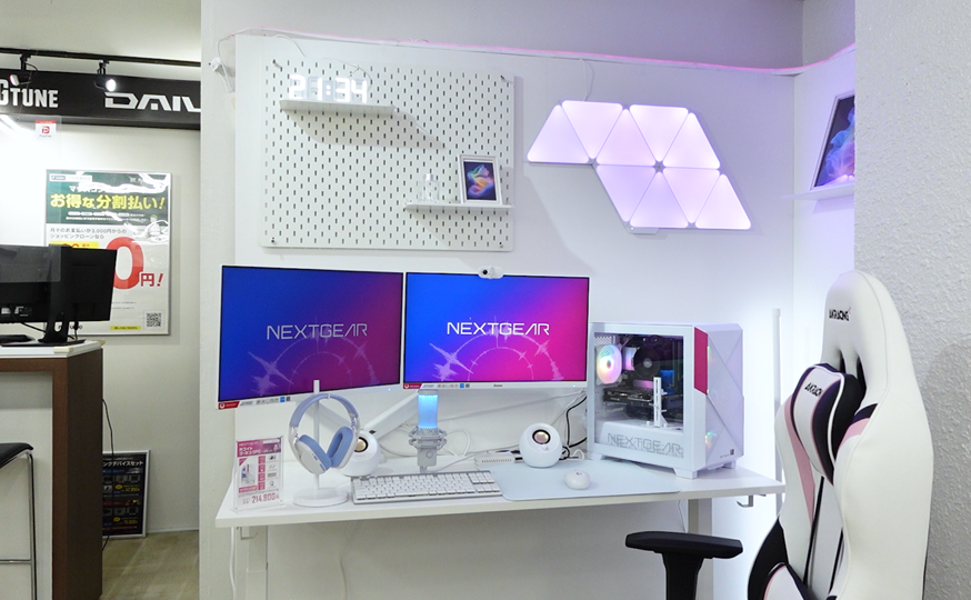 人気のNEXTGEARのミニタワーデスクトップパソコン「NEXTGEAR JG-A7G6T」ホワイトモデルを中心に、液晶ディスプレイ、ヘッドセットなどもホワイトで統一した、NEXTGEAR JG-A7G6T(ホワイト5点セット)となります。また、自宅でのゲーミング環境をイメージできる展示となっています。