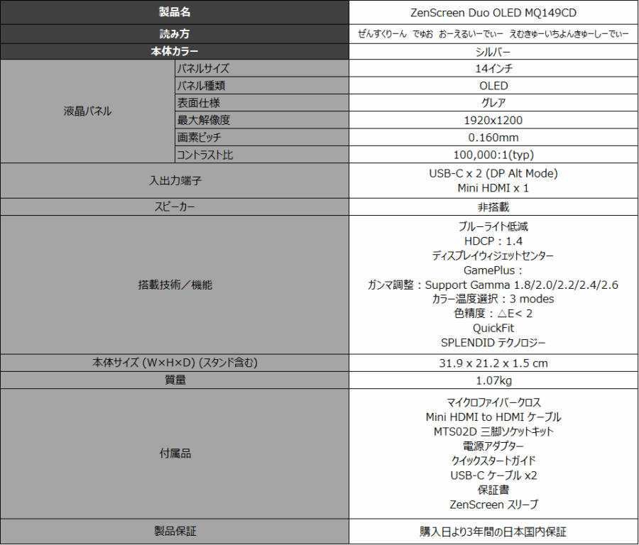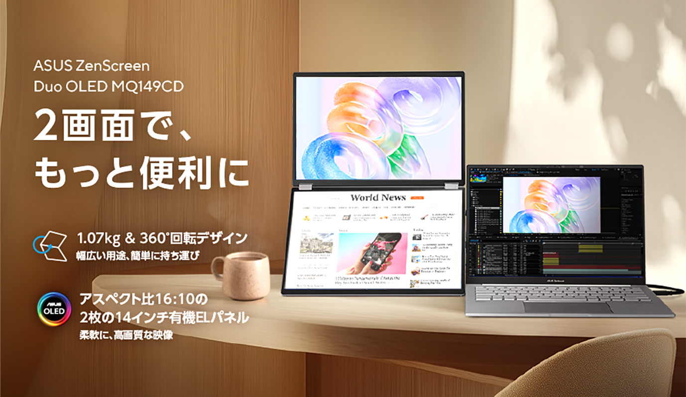 製品詳細:https://www.asus.com/jp/displays-desktops/monitors/zenscreen/zenscreen-duo-oled-mq149cd/