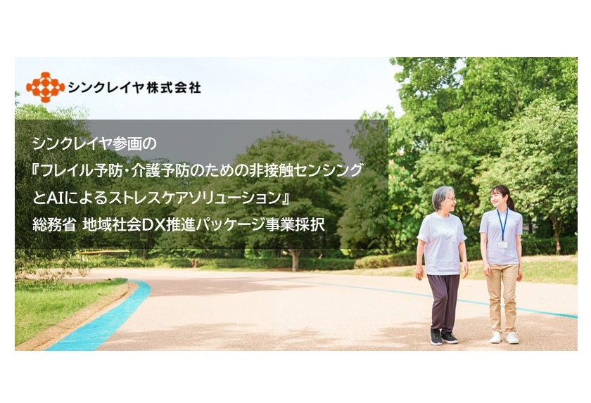 シンクレイヤ(東証スタンダード:1724、代表取締役社長:山口 正裕、本社:名古屋市)(以下、当社)は、広域高速ネット二九六(代表取締役社長:藤本 光弘、本社:佐倉市)を代表機関とし、千葉大学(学長:横手 幸太郎、所在地:千葉市)、メンサポ(代表取締役兼CEO:廣瀬 素久、本社:千葉市)、佐倉ゆうゆうの里(施設長:田中 寿之、所在地:佐倉市)、佐倉市で構成されたコンソーシアムの一員として提案した『フレイル予防・介護予防のための非接触センシングとAIによるストレスケアソリューション』が、総務省「地域社会DX推進パッケージ事業(無線技術を活用した先進的な課題解決モデルの創出・横展開のための社会実証)」に採択されたことを発表した。