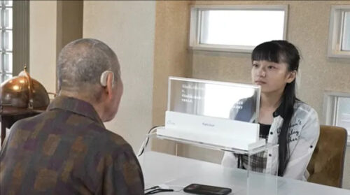 透明ディスプレイ「Ralclear」を対面する人の間に設置し、会話の内容をテキストで表示する