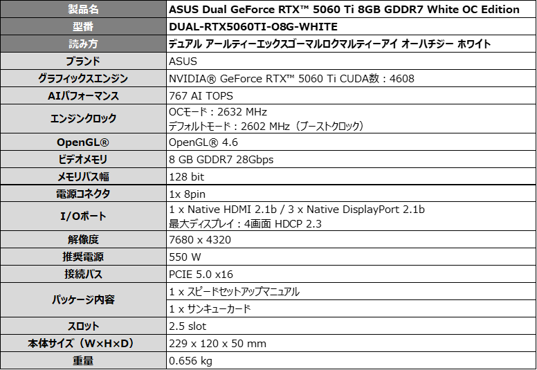 ASUS、デュアルファン、ホワイトモデルのビデオカード2モデル「DUAL-RTX5060TI-O8G-WHITE」および「DUAL-RTX5060-O8G-WHITE」を発表