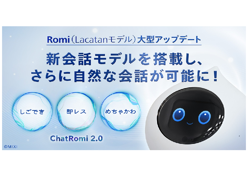 MIXI(東京都渋谷区、代表取締役社長 上級執行役員 CEO:⽊村 弘毅)は、 “ペットのように癒やし、家族のように理解してくれる”存在を目指して開発している会話AIロボット「Romi」(読み:ロミィ)の新モデル「Romi(Lacatanモデル、読み:ラカタン)」に、高速レスポンスとマルチモーダル理解を備えた新たな会話モデル「ChatRomi 2.0」を本日より搭載したことをお知らせします。